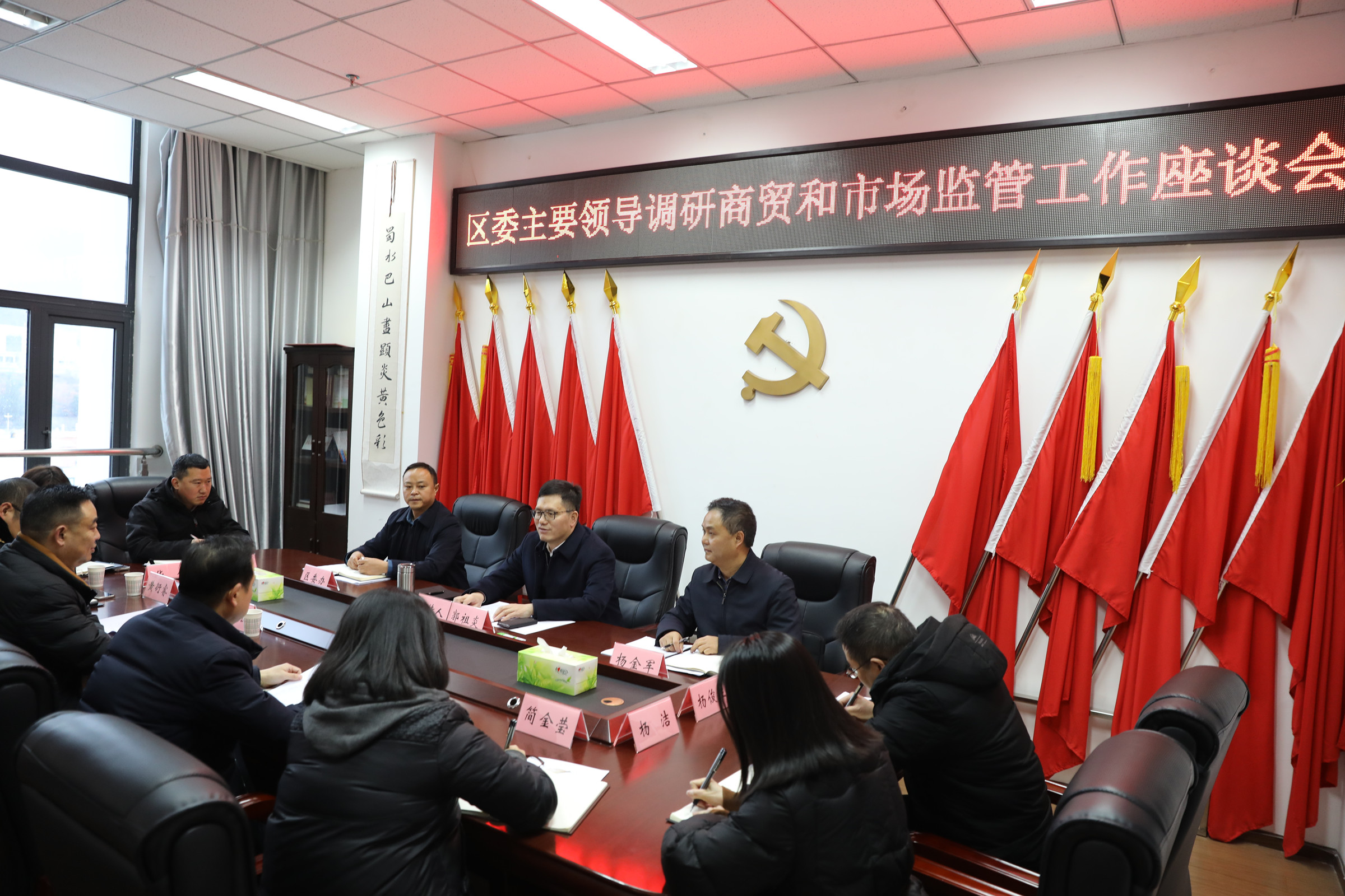 座谈会上,郭祖炎听取了区商务局、区市场监督管理局关于商贸经济运行情况和市场监管服务的工作汇报。他指出,近年来,全区商贸经济指标平稳,项目建设与产业融合成效显现,同时,市场监管履职尽责、保障有力,展现了干部务实担当和“小区也要争一流”的进取精神,值得充分肯定。要继续保持良好势头,把思想和行动统一到区委、区政府的决策部署上来,进一步增强责任感和使命感,形成推动工作的强大合力。他强调,商务和市场监管工作关联性强、互补性强,要强化协同、密切配合,以“系统思维”构建“党委领导、政府负责、部门协同、企业参与”的“一盘棋”工作格局,着力抓好各项重点工作,推动商贸经济提质增效与高质量发展。要坚守“保安全、促公平、护权益”核心,坚持“服务型监管”理念,以“零容忍”态度严打违法行为,坚决守住安全底线。要加强政治理论、政策学习和业务培训,增长综合知识储备,努力成为“懂产业、会服务、善监管”的行家里手。