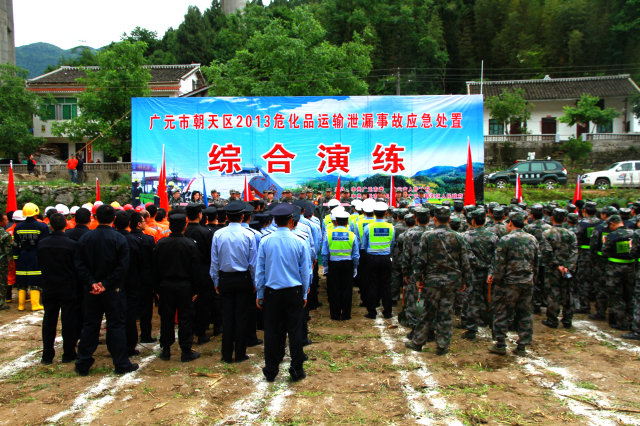本网讯(文·图 杨春恩 谢翀)5月9日上午,朝天区按照市委、市政府统一安排部署,在市级有关部门的大力指导下,组织开展2013年应急疏散及危化品运输泄露事故应急处置综合演练活动,参演队伍精心准备、密切配合,全面完成了应急响应、危化品泄漏处置、水源监测与应急供水等十二个科目。蔡邦银、伏玉琼、梁黎、贾光升等在家的区四大班子领导,市区20多个部门和企业、300多人及30多部各种救援车辆参加演练。