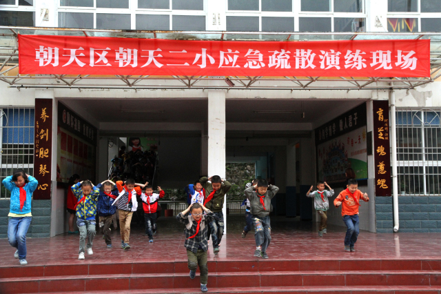 【镜头二】上午九时。朝天二小。演练模拟警报信号拉响后,在教室上课的学生和教师按预定路线,从预定楼梯口就近紧急疏散下楼,仅用2分多钟,所有师生都安全撤离到操场的各班的指定点。学生到达操场后,各班立即清点人数,向学校层层汇报。整个疏散演练过程安全、顺利、迅速、有序。区委书记蔡邦银,区委常委、区委办主任李城,区教育和科学技术局、区人防办、区防震减灾局、区红十字会相关负责人现场观摩和指导该校的防震疏散演练,并对师生进行了针对性的安全教育。