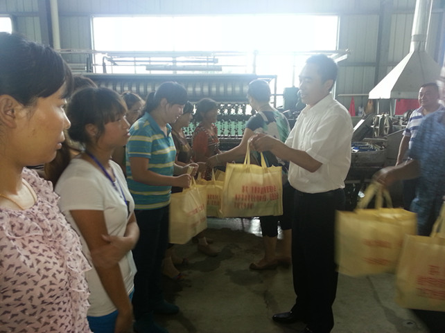 8月14日,市总工会副主席燕家武一行到三元茧丝绸有限公司开展了送清凉活动,给该公司女职工每人送去了降暑药、毛巾、矿泉水等慰问品,共价值3000余元。