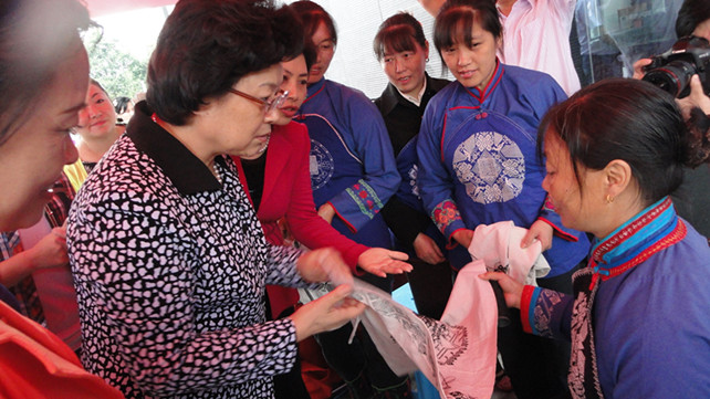 (全国妇联副主席、书记处书记、中国妇女发展基金会副理事长甄砚与麻柳绣女交谈)