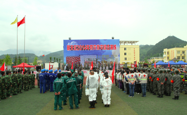 本网讯(谢翀)5月13日上午,朝天区按照市委、市政府统一安排部署,组织开展2014年防灾救灾综合应急演练,参演队伍精心准备、密切配合,全面完成了指挥决策和应急救援队伍拉动集结、道路交通及地质灾害应急处置、应急疏散避险、幸存者搜救、石油泄漏及河道污染处置和灾民安置、医疗救护、卫生防疫、电力通讯抢险等6项11个科目。蔡邦银、伏玉琼、梁黎、张晓春、罗凌云等在家的区四大班子领导,33个单位和部门、18支应急抢险队伍400余人参加演练。