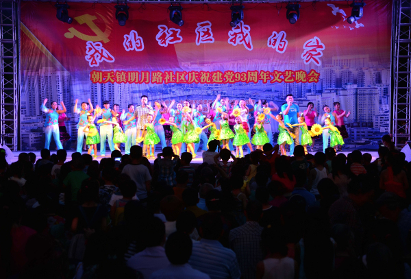 (张玉伟)掌声贺七一,歌舞迎佳节。7月1日,朝天镇明月社区以“我的社区我的家”为主题,举办了庆祝中国共产党成立93周年庆“七一”文艺晚会,为广大社区居民朋友奉献上一道精美的文化大餐。