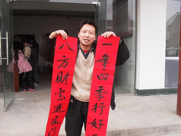 春节将至,为给文安乡村民送上一份新春礼物,广元市书法协会副会长、广元中学副校长杜光亚主动放弃休息时间,与两位老师一道为村民书写春联。