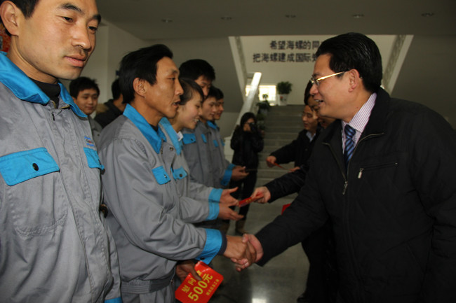 在广元海螺水泥、塑编公司,蔡邦银、伏玉琼同企业员工亲切交谈,向他们送去了节日慰问金、慰问品,同时代表区委、区人民政府向公司全体员工致以节日的问候和新春的祝福。