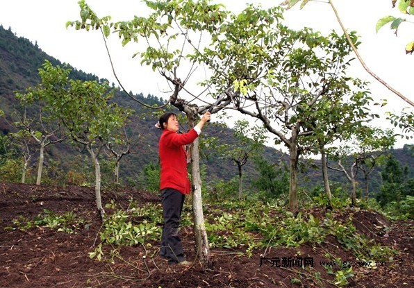 (图为沙河镇三湾村村民正在给核桃树修枝。)