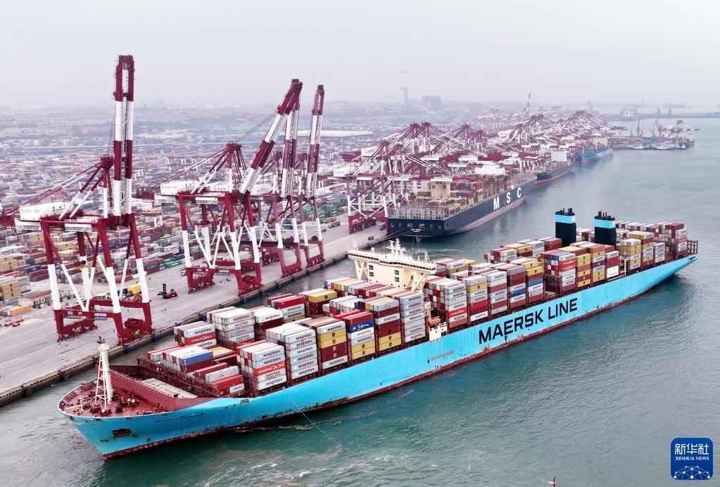 在山东港口青岛港前湾码头,欧洲贸易航线的“美途马士基”集装箱货轮解缆起航(2022年7月29日摄,无人机照片)。新华社记者 李紫恒 摄