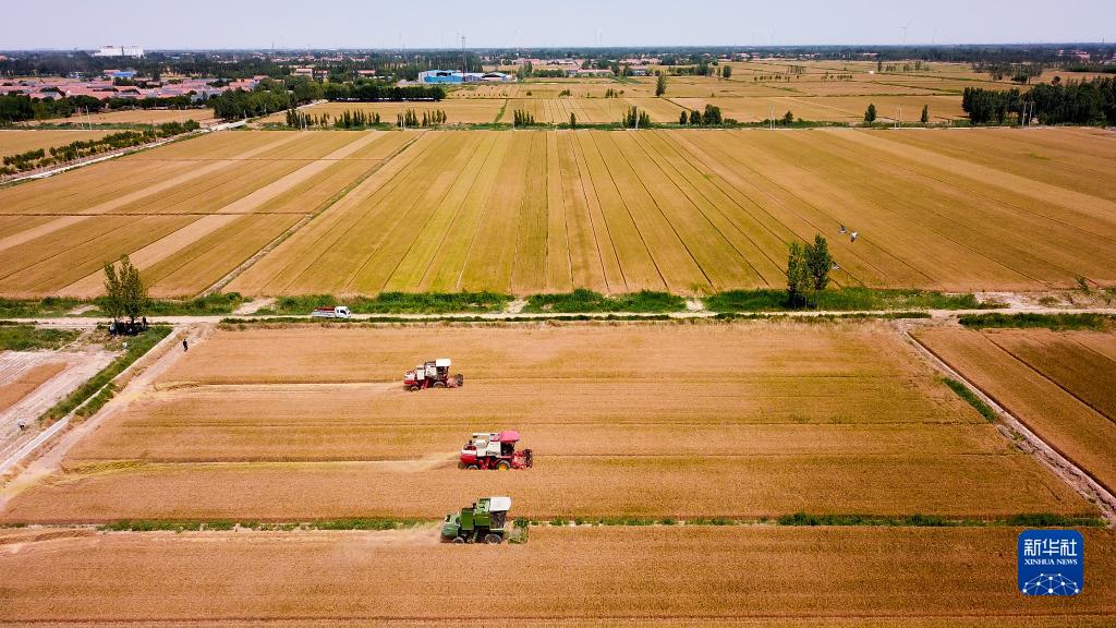 在山东省惠民县桑落墅镇,农民驾驶农机收获小麦(2022年6月7日摄,无人机照片)。新华社记者 郭绪雷 摄