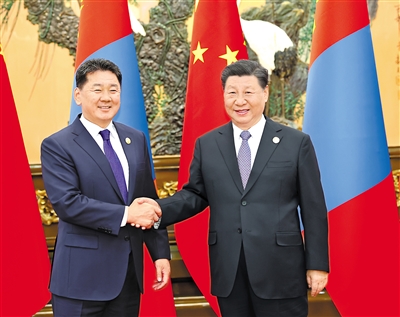 10月19日上午,国家主席习近平在北京人民大会堂会见来华出席第三届“一带一路”国际合作高峰论坛的蒙古国总统呼日勒苏赫。