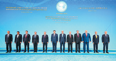 当地时间7月4日上午,国家主席习近平在阿斯塔纳独立宫出席上海合作组织成员国元首理事会第二十四次会议。这是习近平同上海合作组织成员国领导人集体合影。