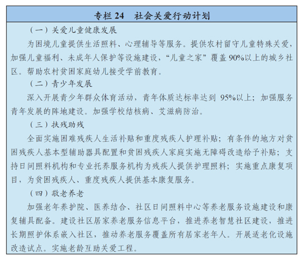 支持残疾人事业发展,建立健全残疾人基本福利制度,实现残疾人基本民生兜底保障。完善重度残疾人医疗报销制度。优先保障残疾人基本住房。完善残疾人就业创业扶持政策,健全公共机构为残疾人提供就业岗位制度。加强残疾人康复和托养设施建设,鼓励社会力量提供服务。加强残疾人无障碍设施建设和维护。实施0-6岁残疾儿童康复、贫困残疾人基本型辅助器具适配等重点康复工程。建设康复大学,培养康复专业技术人才。