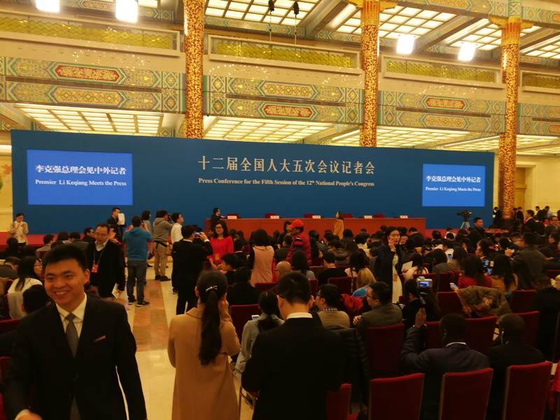距离总理记者招待会还有不到一个小时了!人民大会堂金色大厅已经座无虚席。全球各路媒体的记者早早来到这里抢占最佳位置。在十二届全国人大五次会议闭幕后,李克强总理将在这里会见中外记者,并回答提问。