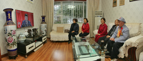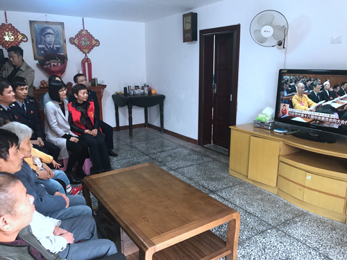 江西省萍乡市莲花县,龚全珍老阿姨在和家人邻居一起收看十九大开幕会。吴菁 摄
