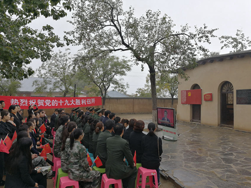 西柏坡纪念馆部分干部职工、西柏坡消防中队和石家庄市邮政局部分干部在中共中央旧址七届二中全会会址前一起观看党的十九大开幕会,许多各地赶来的观众也自动加入收看的队伍。陈汝健 摄