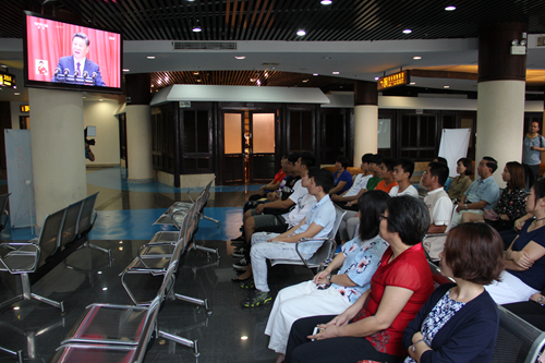 海南三亚国际邮轮港干部职工和游客一起,观看党的十九大开幕会。吉羽 摄