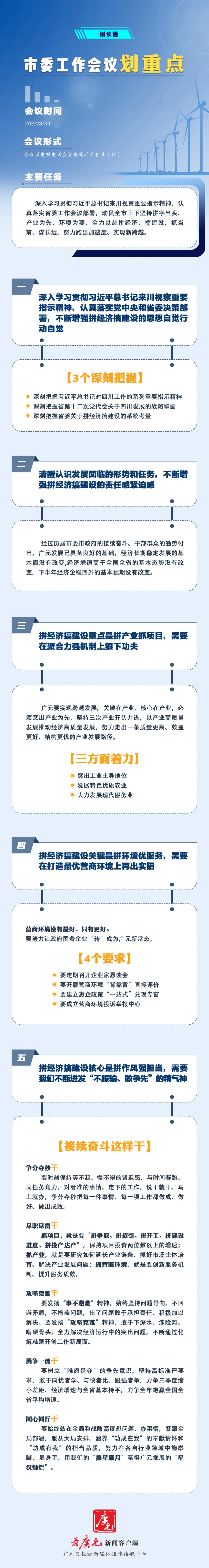 8月30 日,广元市委工作会议召开,动员全市上下坚持拼字当头、产业为先、环境为要,全力以赴拼经济、搞建设,抓当前、谋长远,努力跑出加速度、实现新跨越。