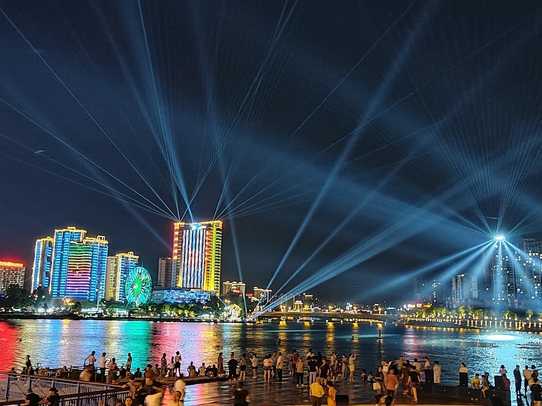 8月27日晚,栖凤湖夜游活动现场,铺设在嘉陵江两岸的数百个灯组表演着美轮美奂的光影秀,展示着栖凤湖沿线夜景的独特魅力。
