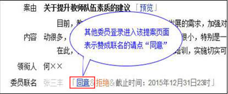 被通知联名的委员登录系统进入首页,点“提案”图标进入提案目录页面,选择“提案首页—我的提案”(参照图3),找到请求自己联名的提案,点击“提案案由(标题)”进入内容页面。如果表示赞同则点“同意”,不赞同则点“拒绝”,同意后也可以在规定时限内“撤销联名”(如图6)。