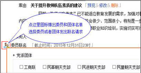 提交成功后系统自动跳转到提案内容页面,如果提案人还想邀请其他委员或者团体联名的,点击“委员联名”前面的图标弹出委员和团体名单,在对方用户名前面方框内划勾即可发出联名请求(如图5)。