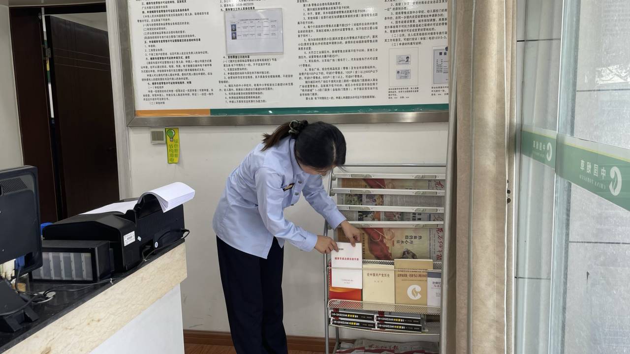 在朝天区烟草专卖局的服务大厅,有一处特殊的“图书角”,不仅陈列着办事指引,还摆放着《民法典100问》《烟草专卖法律法规一本通》等法律书籍和普法宣传手册。