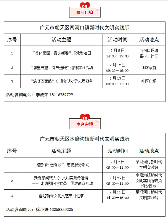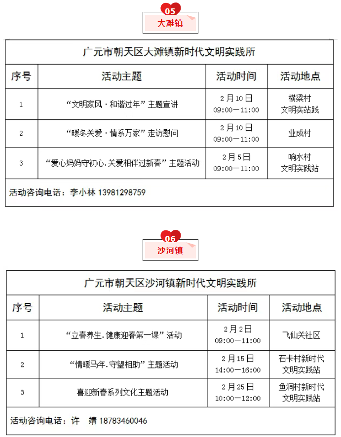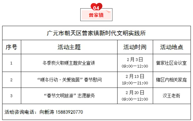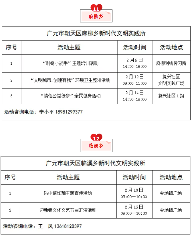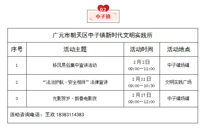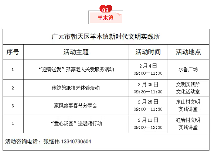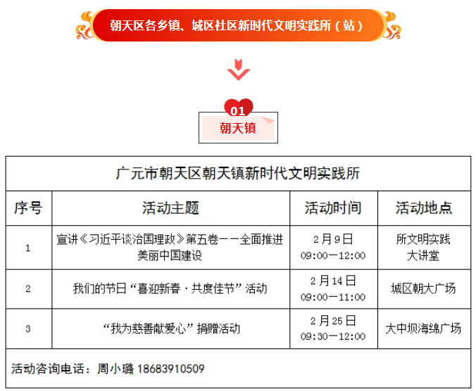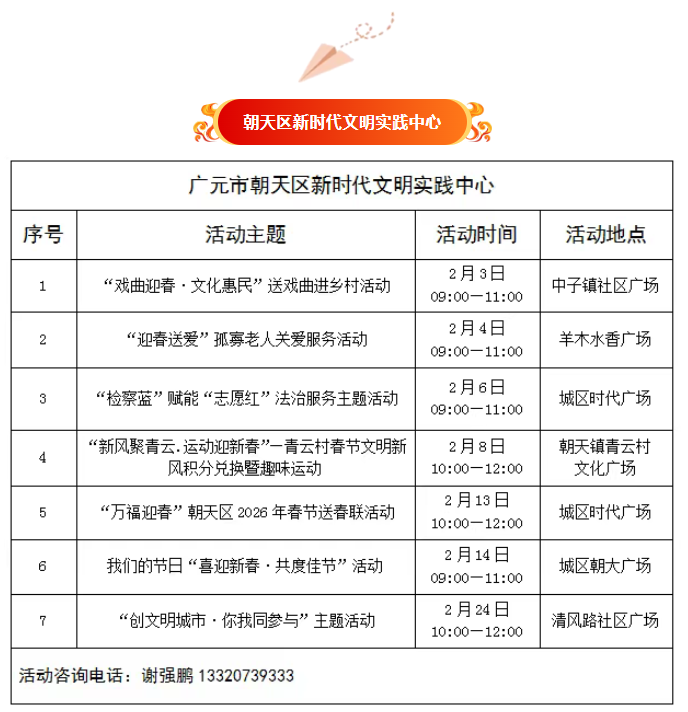 为推动新时代文明实践活动提质增效,充分发挥新时代文明实践中心(所、站)作用,现将朝天区新时代文明实践中心(所、站)2026年2月份部分活动计划清单公布如下,欢迎广大群众积极参与。
