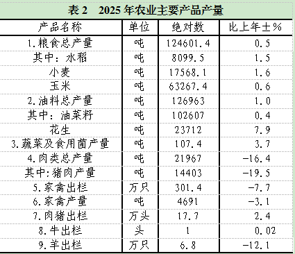现代农业稳步发展。扛牢粮食安全责任,守住耕地保护红线,新(改)建高标准农田2.1万亩,粮食产量12.46万吨。加快“天府森林粮库”建设,农村产业融合发展项目(一期)、产业强镇(二期)加快推进,核桃产量连续17年稳居全省县区首位,朝天核桃连续4年上榜全国百强区域品牌(地理标志),沙河镇罗圈岩村林下中药材基地被评为“天府森林粮库”省级基地,入选全市首批林下经济产业发展典型案例。发布“曾家山蔬”区域公用品牌。生猪稳产保供有力,成功创成全省首个省级牛羊布病净化示范区。全年粮食播种面积43.7万亩,下降0.1%,其中小春粮食播种面积17.6万亩,大春粮食播种面积26.1万亩,粮食总产量12.5万吨,增长0.5%。年末生猪存栏11.9万头,下降5.3%,其中能繁母猪1.1万头,增长0.5%。全年生猪出栏17.7万头,增长2.4%,猪肉总产量1.4万吨,增长19.5%;牛出栏1.0万头,增长0.02%;羊出栏6.8万只,下降12.1%;家禽出栏301.4万只,下降7.7%。