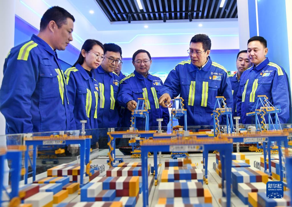 张连钢(右三)在青岛港带领技术团队进行新课题研究(2020年12月27日摄)。新华社记者 李紫恒 摄