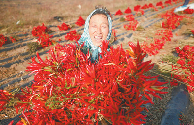 把广大农民对美好生活的向往化为推动乡村振兴的动力,切实落实强农惠农富农政策。图为2019年10月,辽宁省法库县秀水河子镇长岗子村村民喜获辣椒丰收。