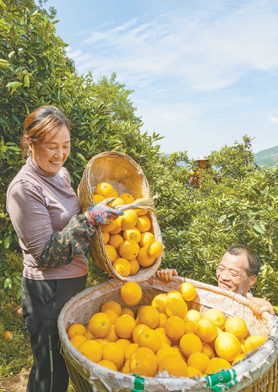 加快促进农民增收,让广大农民都过上幸福美满的好日子。图为2022年4月,湖北省秭归县水田坝乡下坝村村民将刚收获的脐橙装筐。