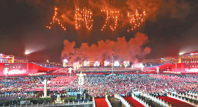 始终坚持人民主体地位。江山就是人民,人民就是江山,人民当家作主是社会主义民主的本质和核心。图为2019年10月1日晚,庆祝中华人民共和国成立70周年联欢活动在北京天安门广场举行,“人民万岁”的焰火在夜空璀璨绽放,天地交相辉映,铺展出辉煌盛世图景。