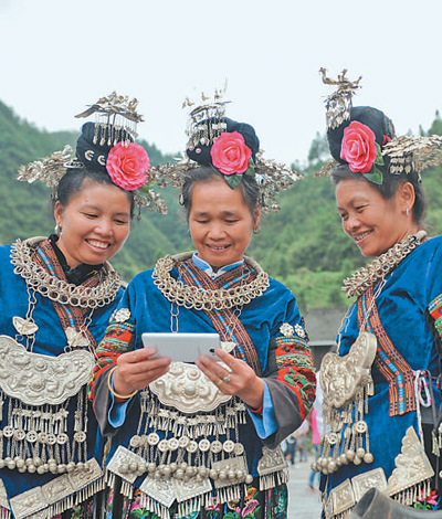 加强党对网信工作的集中统一领导,互联网内容建设与管理成效显著,国家网络安全屏障进一步巩固,信息惠民便民水平明显提高。图为2017年6月,贵州省雷山县西江镇村民通过移动网络观看手机直播节目。