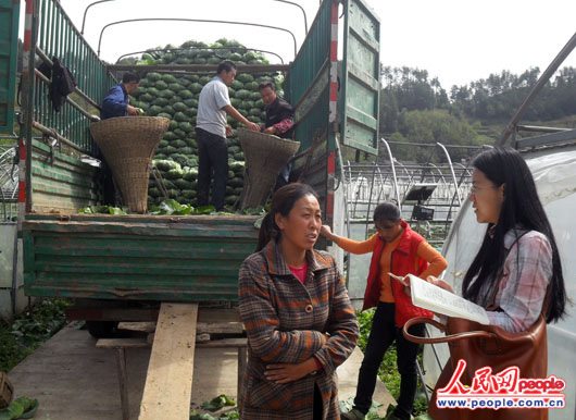 2012年9月28日,在四川省广元市朝天区平溪乡的现代农业园区,平溪乡蔬菜专业合作社社长、支部书记严大琼正和村民们往大卡车上装甘蓝,一个个甘蓝又大又圆,不一会儿就装了满满一卡车。