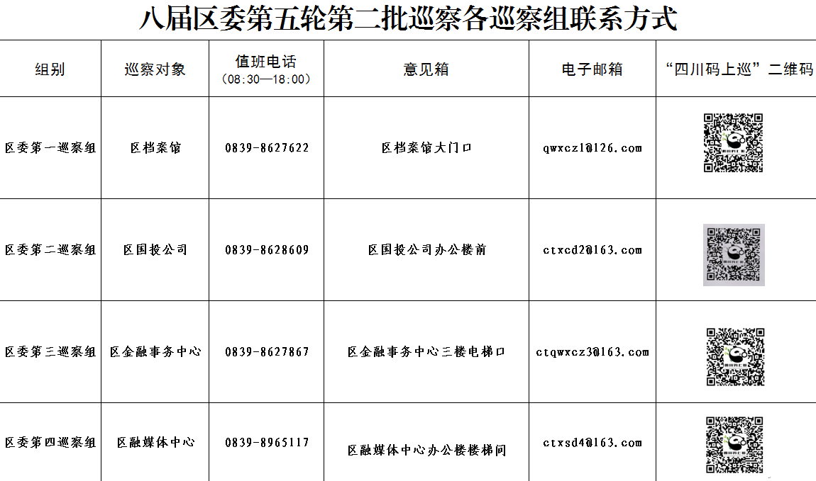 根据工作安排,巡察期间,各巡察组设专门值班电话,开通电子邮箱、信访意见箱和“四川码上巡”二维码等信访渠道,受理电话信访的时间为工作日8:30至18:00,主要受理反映被巡察党组织领导班子及成员、下一级党组织主要负责人和重要岗位领导干部问题的来信来电来访,重点是违反政治纪律、组织纪律、廉洁纪律、群众纪律、工作纪律和生活纪律等方面的举报和反映。对其他不属于巡察受理范围的信访问题,将按规定转交相关部门办理。