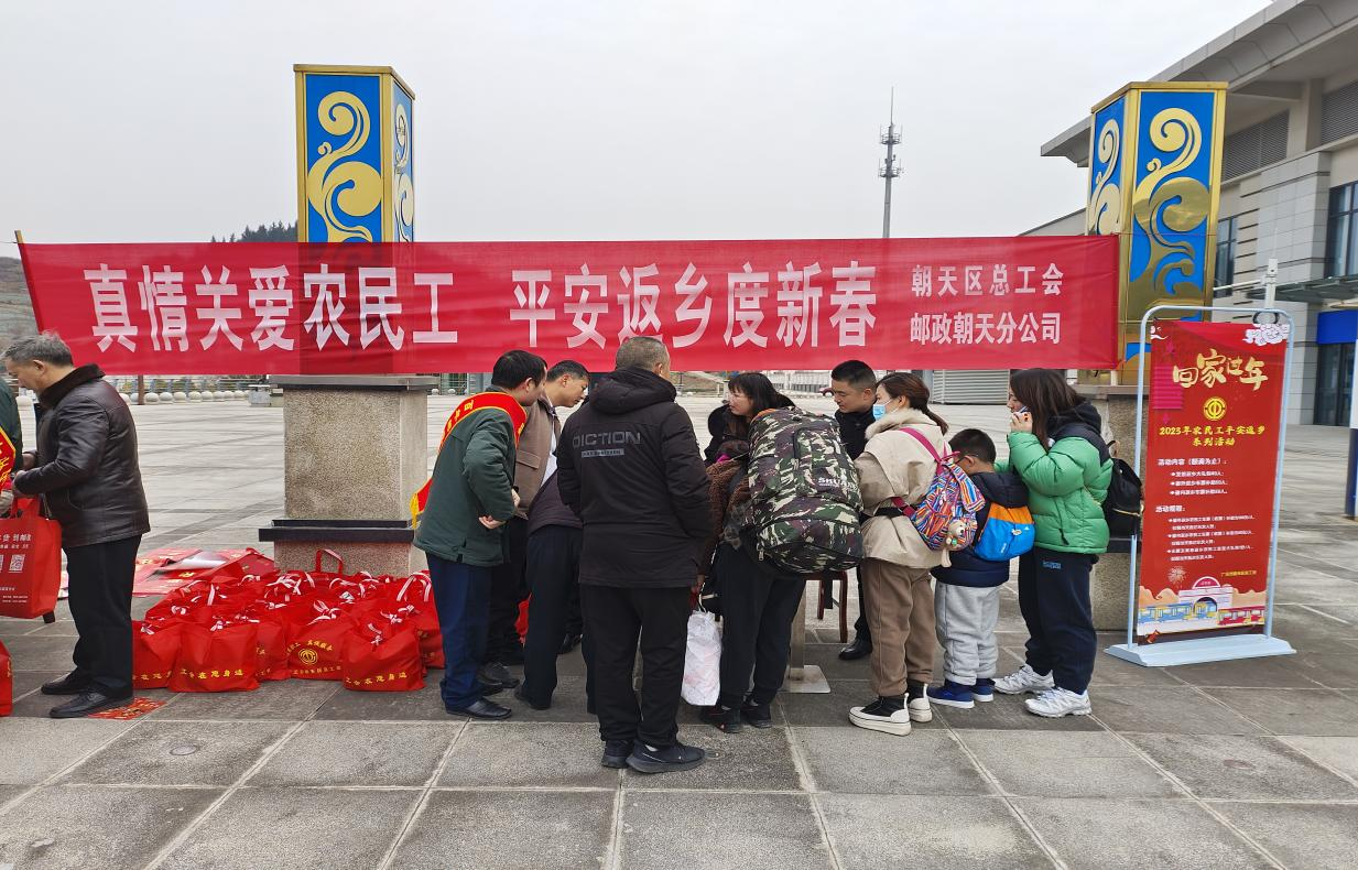 “外出务工返乡人员凭车票可以到这里来领取返乡补助,省内返乡人员补助50元,省外返乡人员补助100元......。”1月25日,朝天区总工会在西成客专朝天高铁站开展“真情关爱农民工 平安返乡度新春”慰问活动,为外出务工返乡农民工发放车票补助和新春大礼包。