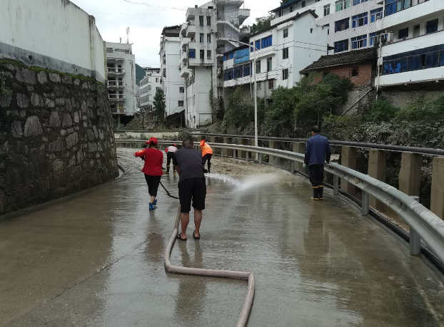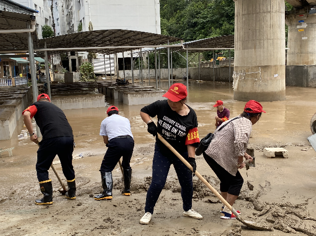 一大早,大滩镇党员干部及社区群众们拿着“武器”便开始了对农产品交易场所及道路进行清理。面对满地垃圾和厚积的淤泥,他们发挥不怕脏、不怕累的精神,用手挖出白色垃圾,用铁锹铲除淤泥,用水冲刷地面……力求尽快净化洪水淹没后的带来的环境污染。
