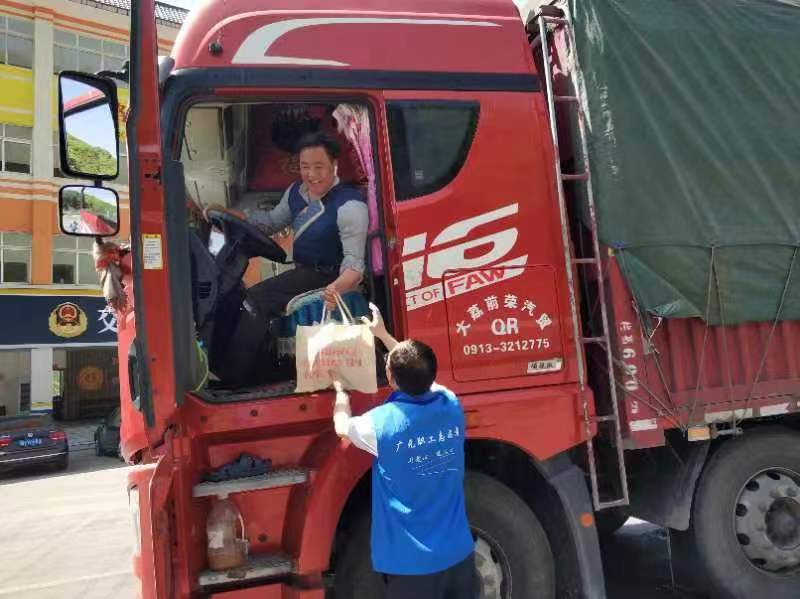 “师傅,您好。劳动节还在路上奔波,你们辛苦了!这是我们为你们准备的方便面、核桃饼、矿泉水,请收下。”4月29日,“五一”假期第一天,广元市、朝天区两级工会的工作人员齐聚G5京昆高速七盘关服务区,为短暂休息停靠的货车司机送上了慰问暖心包。