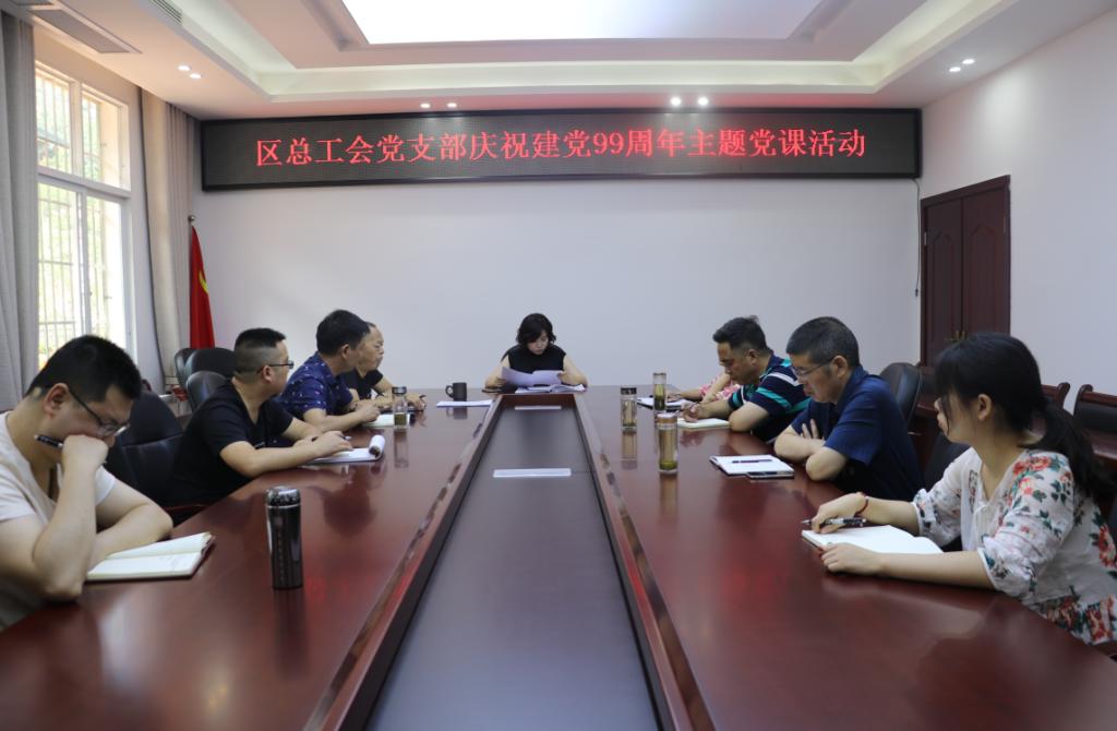 6月30日,区总工会开展庆祝建党99周年主题党课活动,共同回顾党的光辉历程,展望党和人民事业发展的光明前景,动员全体广大党员干部进一步坚定信念、对党忠诚、履职尽责、奋发有为,更加充满信心朝着实现全面建成小康社会奋斗目标、实现中华民族伟大复兴的中国梦胜利前进。