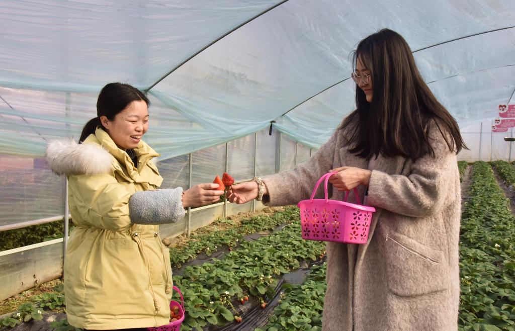 “像靳维学这样在基地务工年收入超过5万元的,至少有十多户,其余的年户均收入也基本在2—3万元。”全程参与基地建设、管理的校场村党支部书记严加华介绍,基地按1000元/亩/年在校场村流转土地500亩,群众年收租金50万元;同时,基地优先吸纳100余名当地群众(贫困户)务工,群众年实现收入60余万元;此外,村集体经济还为贫困户提供公益性岗位24个,红火的草莓采摘项目带动周边群众发展农家乐10余家……草莓产业让校场村实现了跨越式发展。