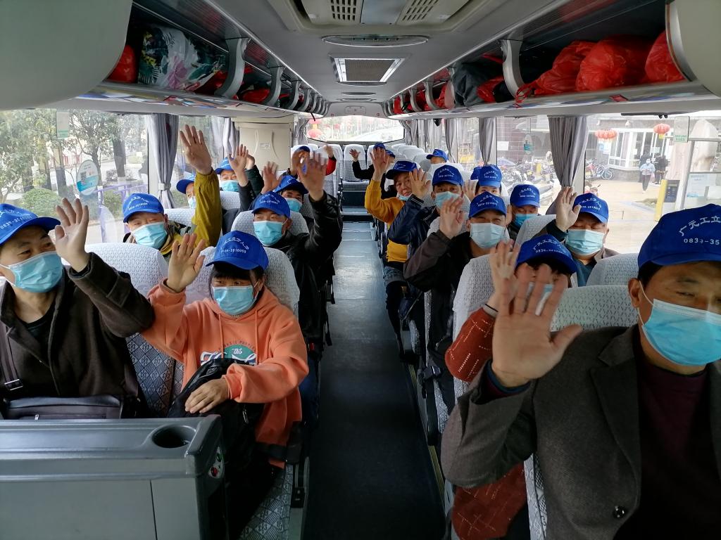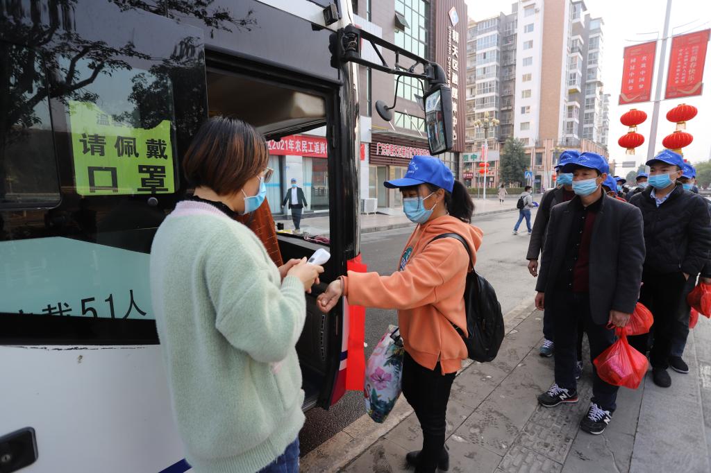 “大家要带好自己的行李,注意出行安全,尤其是乘坐飞机的时候要相互照顾,千万不要走丢了!”出示身份证、健康证明,登记信息,测量体温……就在当日上午8点30分,朝天·路桥劳务协作工作站前,31名朝天籍农民工排队有序上车,他们每人还免费领取到了一份由朝天区人社局提供的“大礼包”,里面有口罩以及面包、矿泉水、方便面等食品。