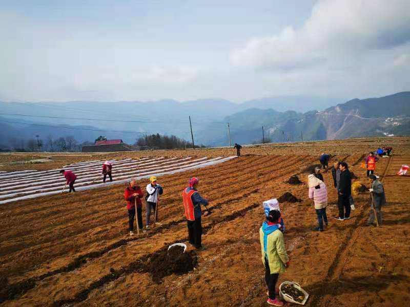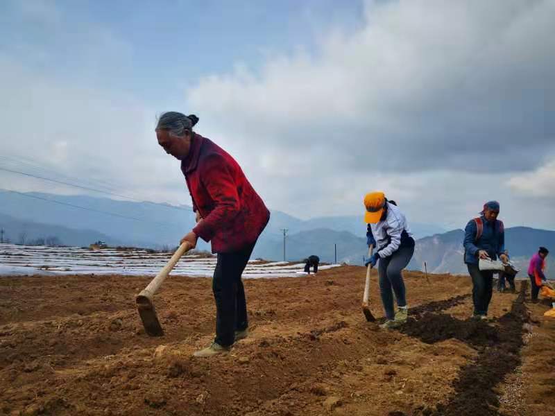 在马铃薯基地里,伴随着大型旋耕机的轰鸣声,田里的土壤变得松软,村民们紧随其后,分工明确,开沟、下种、施肥、盖土、覆膜等各道工序环环相扣,效率提高不少。