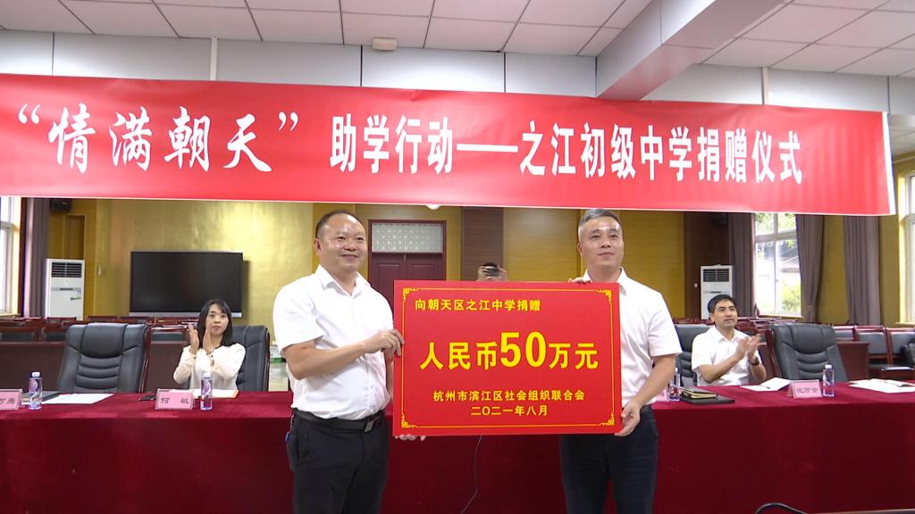 捐赠仪式上,滨江区社会组织联合会向之江初级中学捐赠了助学资金50万元。之江初级中学汇报了浙江省援建以来学校的发展情况,并回赠了锦旗。据悉,捐赠资金将用于安装厨房余热回收转化生活洗浴热水系统,进一步改善该校办学条件,提升办学品位和教育教学质量。