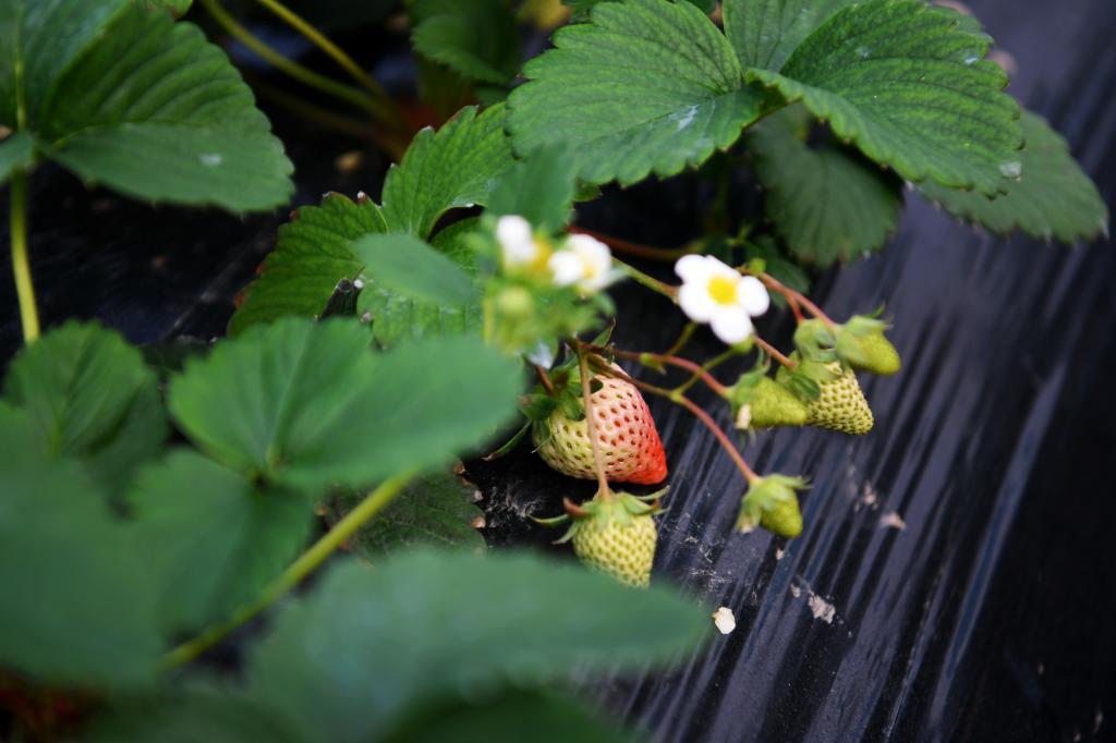 山坳里,一个个现代化温室大棚整齐排列在地里田间。冬寒料峭,棚外寒风萧瑟,而走进大棚里,却是温暖如春,一厢厢绿色的草莓苗开出了白色的小花,一颗颗青白色果子掩映在郁郁葱葱的叶子之间,果子有大有小,少数大果已露出小半红色。