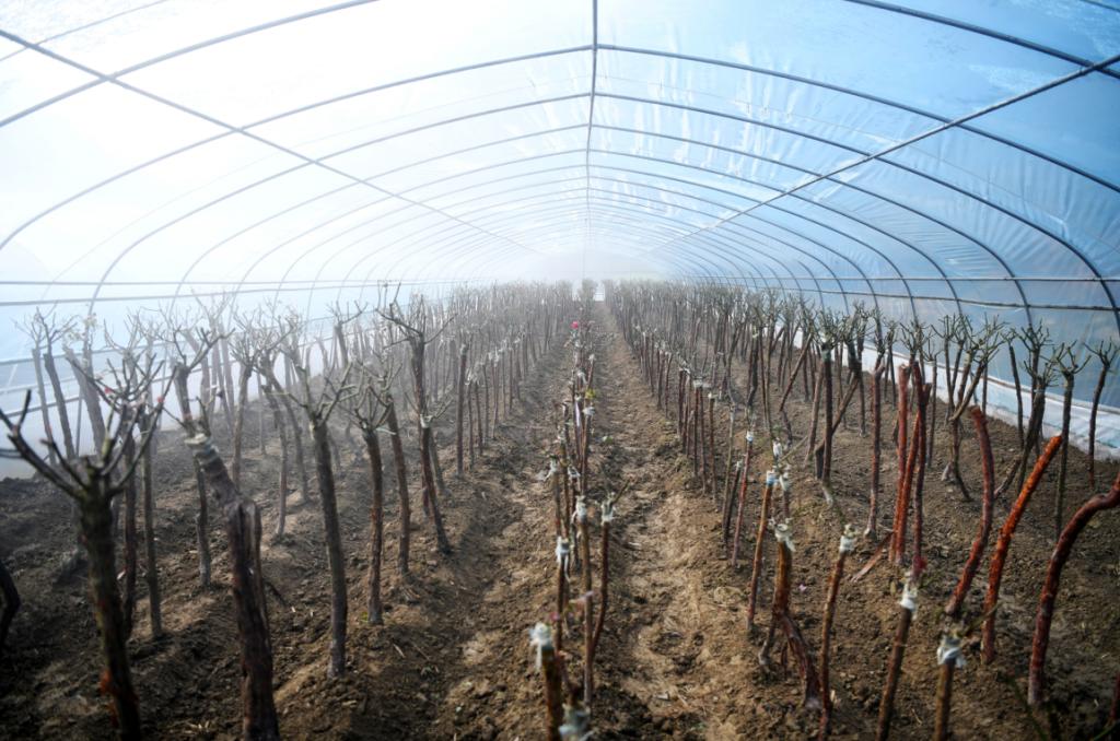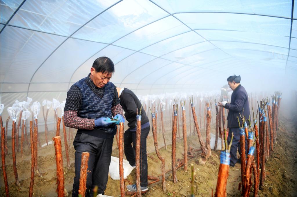 大棚外,村民们正忙着将月季接穗剃刺,并剪成10厘米长,以备嫁接使用。大棚里,一排排高约80厘米的砧木挺拔有力,有的已经嫁接了两三株接穗,有的已经套上了保温袋。