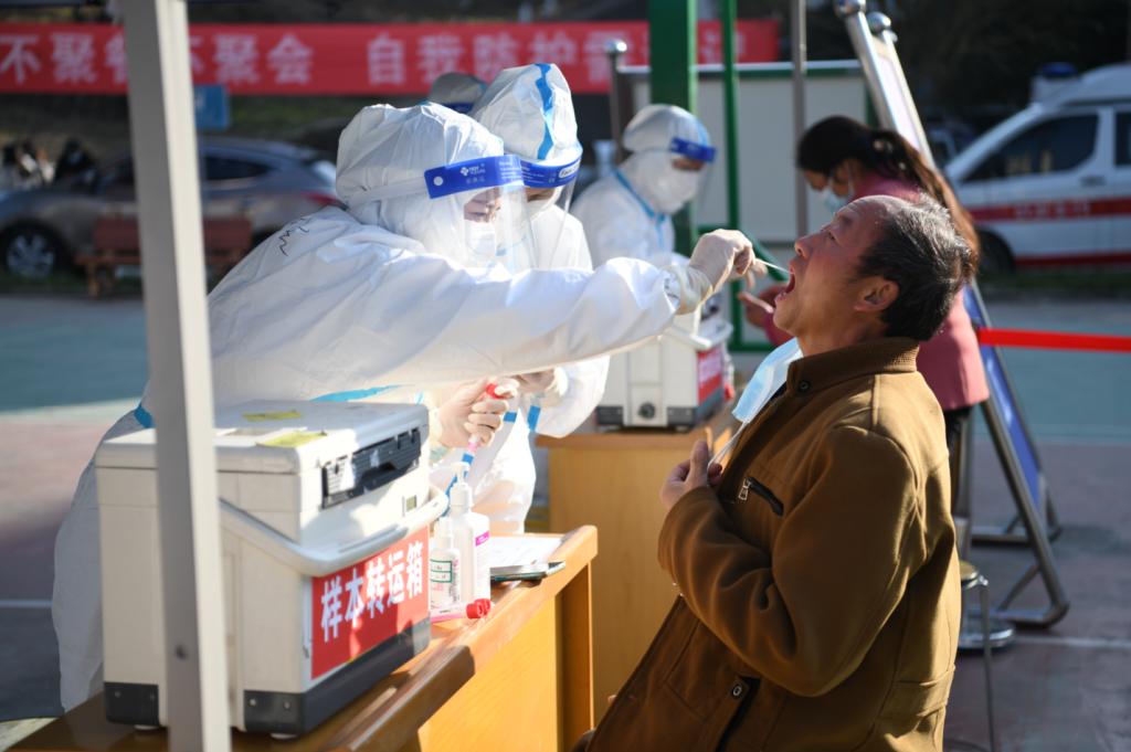 采样人员按照工作流程对受检者进行咽拭子采样 刘旭 摄