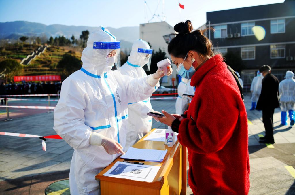 预检分诊现场,医护人员对受检者进行身份登记测体温等 刘旭 摄