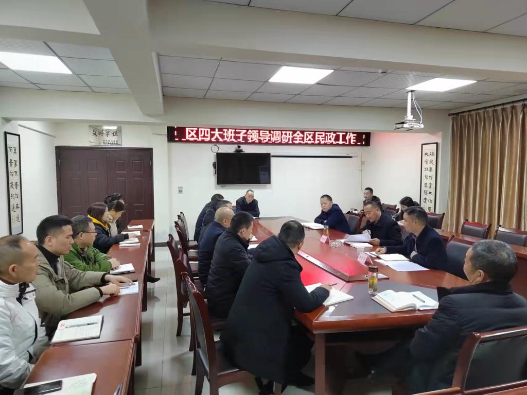 近日,区人大副主任向荣华、区政府副区长杨金军、区政协副主席贾长城四大班子领导赴区民政局调研全区民政工作。区民政局党组班子成员、科级干部及股室、直属事业单位负责人参加调研汇报会。