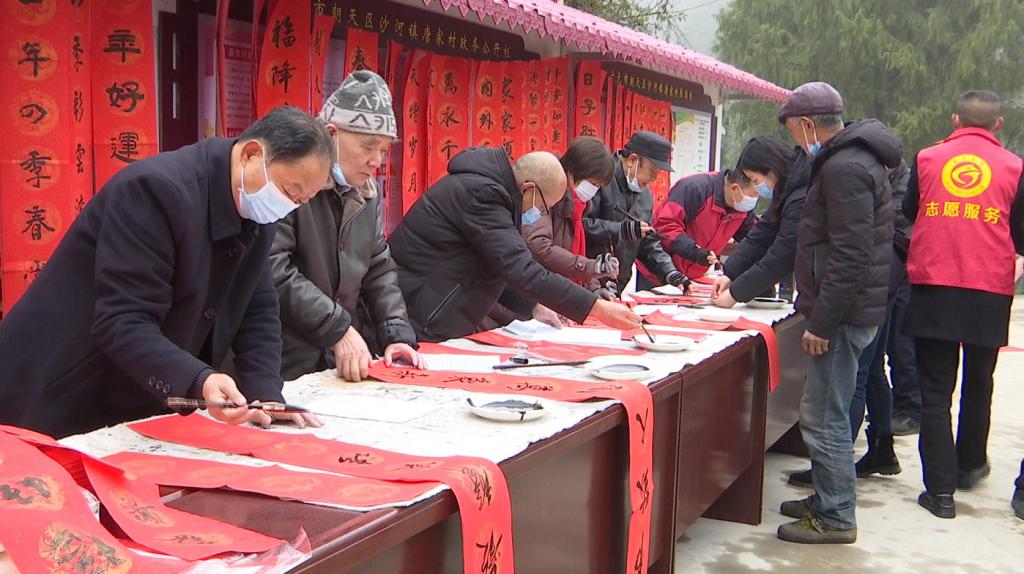 活动现场人头攒动,写好的对联挂满了宣传墙。慰问组向唐家村村民们送去节日的问候,并为脱贫户、困难农民工、困难老党员们送上大米、菜籽油等慰问品。会场一旁,市老年书画研究院的书法家们屏息凝神,写下新春对联赠予村民。沙河镇唐家村六组村民赵绪金谈起家乡这几年来的变化,感慨万千。