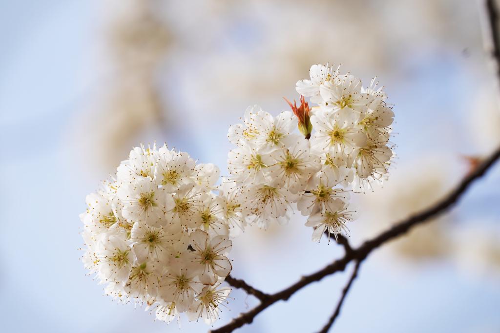 樱花待开之前,花蕾白中带红,花萼花瓣花蕊团抱,如拳头五指紧合。樱花半开还闭时,颜色纯白,花瓣挽臂围栏,呵护孱弱花蕊。盛开的樱花,五个白色花瓣,向着五个方向,各自张开臂膀,振臂狂欢花蕊面世。花蕊密密麻麻,纤细如穿针之线,抖擞如根根麦芒,聚合若大肚花瓶。外环花蕊,形如半开弯弓,矢向四面八方。