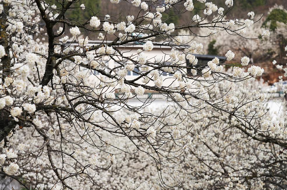 树枝旁斜,花茎虬龙。花柄托起五到七个花蕾。樱花盛开,每朵花就像一个亮白的小气泡。五到七个花朵聚在一起,活像一个松松软软,拳头大小棉花球。三五个花柄形成一簇,二三十多朵樱花,形成气球大小白色花团。成百上千花团,成就树树云霞,汇积片片祥云。