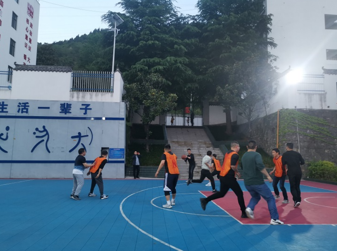 热身活动结束后,操场上,区委组织部篮球队和中青班篮球队组织的篮球联谊赛正上演精彩对决。赛场上,双方队员精神抖擞、身行矫健,瞄准目标你争我夺,传球,过人,起跳,投篮,时而跳投,时而上篮,时而三分远投。场下,加油声、鼓掌声、欢呼声一阵响过一阵。大家积极参与,每一个人都能从中感受到集体运动的快乐,展现了中青年干部积极向上,相互协作,团结拼搏的精神风貌。